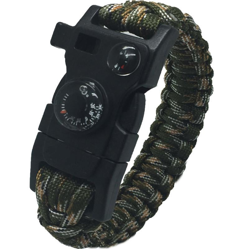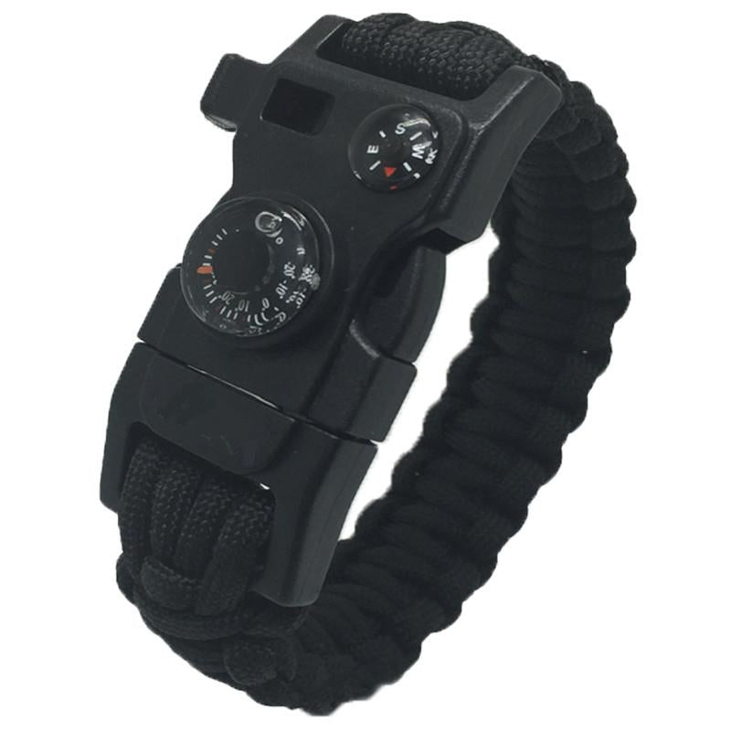 Fling Fire Starter, Whistle, Gear Buckle Camping Ignition Equipment, Rescue Rope Escape Bracelet Travel Kit, Cross & Straight Screwdriver, Scrapper, Monkey Spanner, Seckshant Schraubendreher, Compass, Themometer, Adjustable Wrench, Blade.